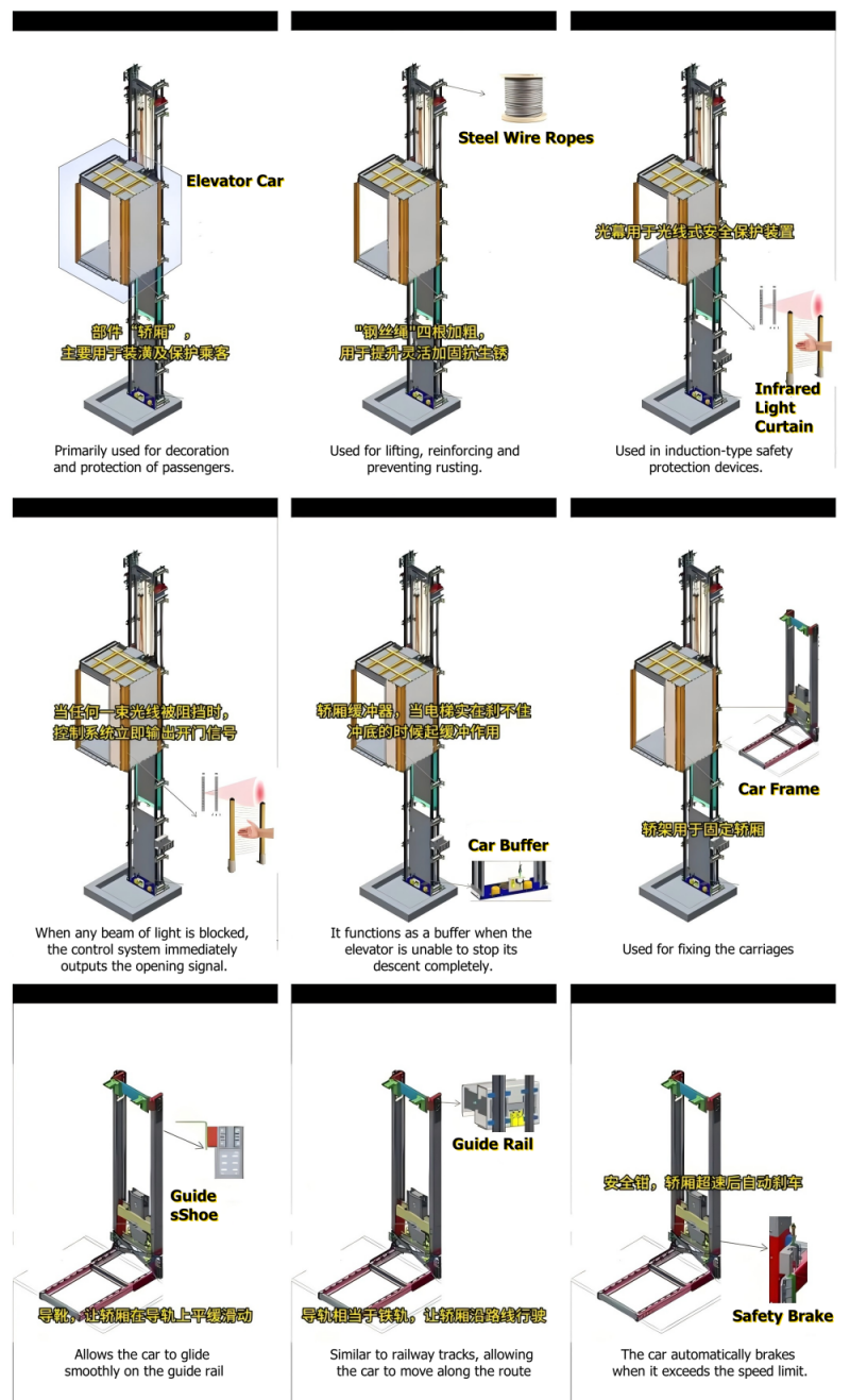 8. Safety Front Car Overspeed Brake: When the elevator is moving too fast, the safety front car automatically brakes to ensure passenger safety.